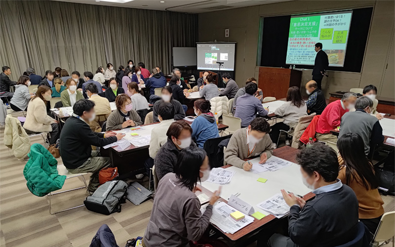 所属機関関係なく、まず意思決定支援の話をする中で「理想と現実」を口にする支援者が多かったです。利用者さん本人の望む生活、仕事、生き方、それが本当に本人にとって良いのか?実現できるものなのか?支援者としては全力で支援したい思いはあるが・・・と途中で言葉に詰まる思いも、深く共感できるものでした。また、利用者さんの思いの引き出し方や信頼関係構築までの道のりなど、各事業所が工夫している内容が聞け、それを付箋で共有することで大きな気づきになりました。